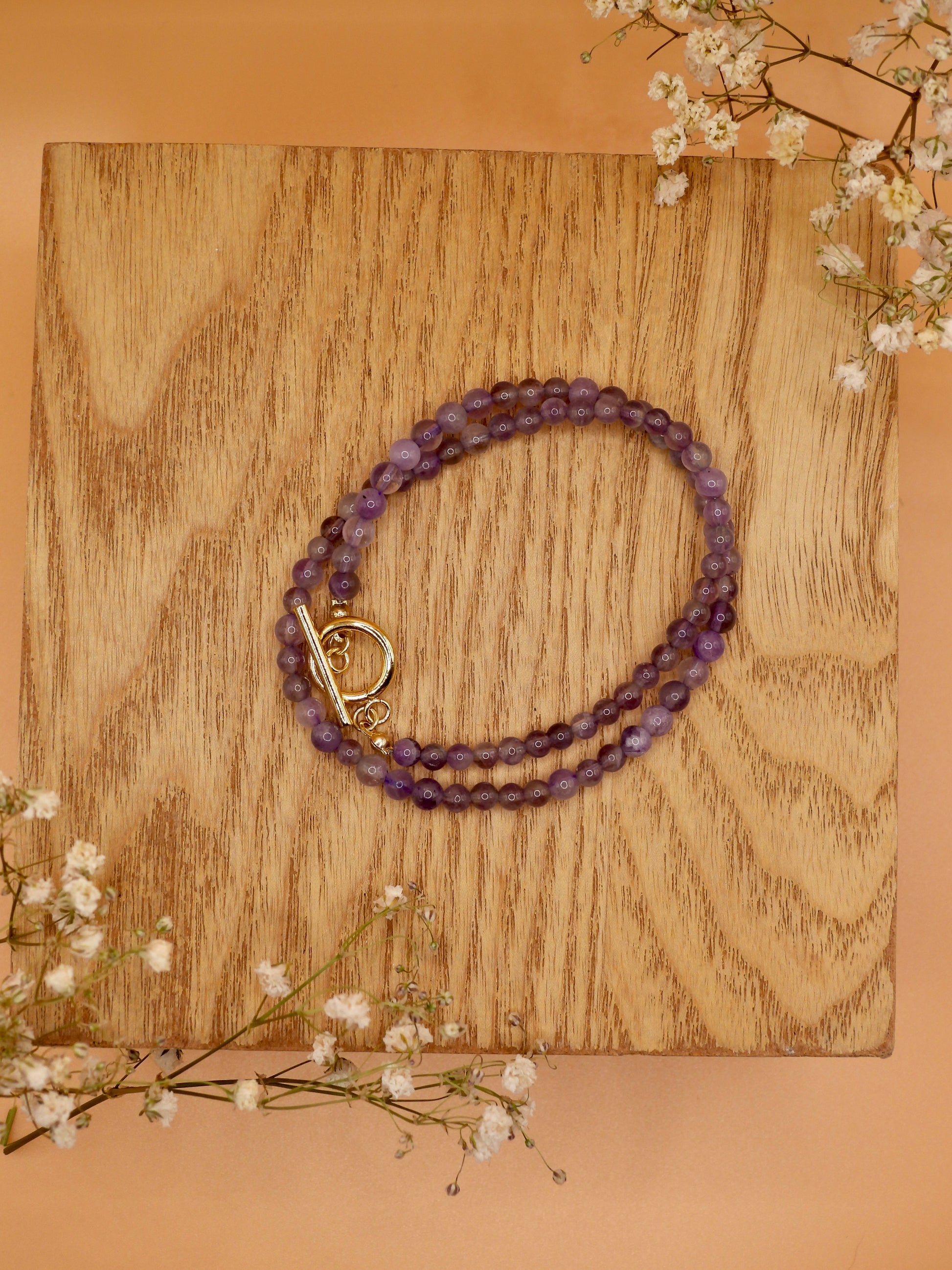 amethyst beads, 14k gold plated attachments, double wrap bracelet